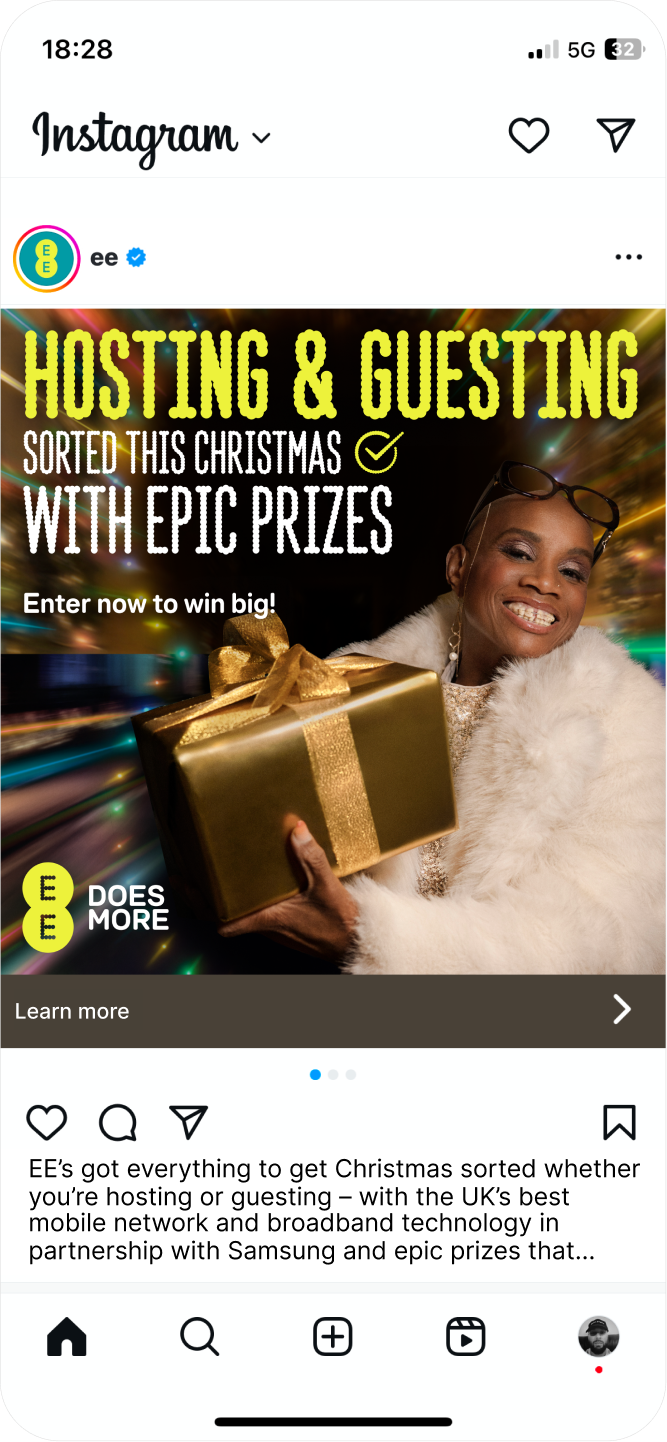 Built around the idea of Hosting or Guesting, the campaign invited customers to pick a side and unlock a stream of daily prizes, tech tips, and unforgettable moments - all brought to life through high-energy ambassador content, and playful design, for 12 days of prizes. From epic headline prizes to bite-sized daily wins, the experience was crafted to feel rewarding, relevant, and unmistakably EE.